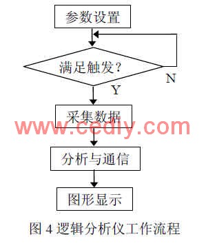 本设计编程语言采用的是 C++,软件流程包括参数设置、触发判断、数据采集、分析与通信、图形显示五个方面,主程序流程如图 5所示。