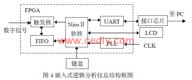 基于 NiosⅡ的逻辑分析仪,采用 FPGA硬件对数据采集和存储,NiosⅡ软核进行交互、控制和通信,并且可以通过 LCD显示所采集数据的逻辑状态或通过 RS-232接口与 PC机通信,在 PC上显示数据的波形并对数据长期存储。另外,通过键盘可对逻辑分析仪的采样频率、触发方式等参数进行设置,这些设置也都可以通过 PC机进行。逻辑分析仪的整体结构如图 3所示。