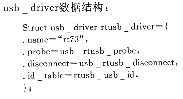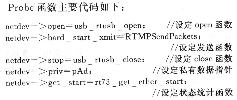 当无线网卡插入USB总线时,USB core就会调用Probe方法来检测被传递进来的信息,以确定无线网卡设备是不是与驱动程序匹配,同时填充struct net_device完成对该网络设备的初始化。当无线网卡被拔出时,USB core就会调用Disconnect方法来完成清除工作。驱动程序通过显示模块的初始化和消除函数注册与注销模块调用module_init来初始化一个模块,并在卸载时调用moduel_exit函数。