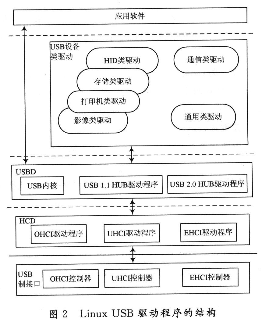 由于USB接口为主从方式和多设备连接的树状网络结构,所以USB主机必须具备对所有连接在总线上不同类型的USB设备进行配置管理的功能。LinuxUSB主机驱动程序可以同时支持多路USB总线功能,每路USB总线独立工作。USB主机驱动由USB主机控制器驱动(HCD),USB驱动(USBD)和不同的USB设备类型驱动三部分组成。图2描述了Linux USB驱动程序的结构。Linux定义了通用请求块(UniversalReqlaest Block,URB),用来在USB设备类驱动程序与USBD,USBD与HCD间进行数据传输。