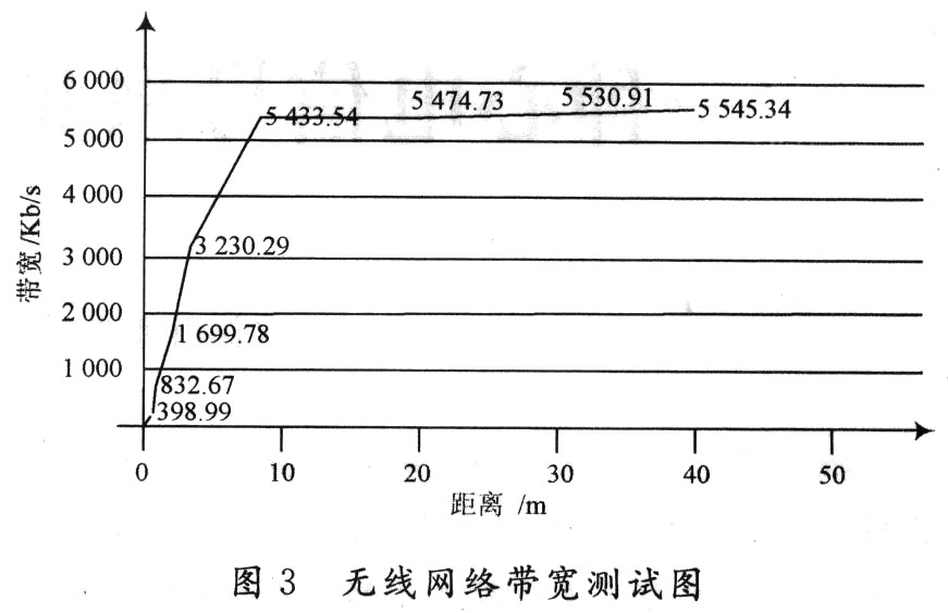 启动无线网络,编写测试带宽程序。该测试程序采用C/S设计模式,客户端运行在ARM开发板上,服务器运行在局域网内一台Linux PC上。改测试程序的工作流程主要如下,客户端分别发送不同大小的字节流,经服务器处理计算出对应的带宽,可以得到一条宽带曲线,进而得到网络实际能够达到的最大带宽。经反复测试,该无线网卡能够稳定工作,在距离AP 50 m的半径内下带宽为6 Mb/s,距离理论值54 Mb/s还有一定距离,具体原因正在分析中。测试结果如图3所示。