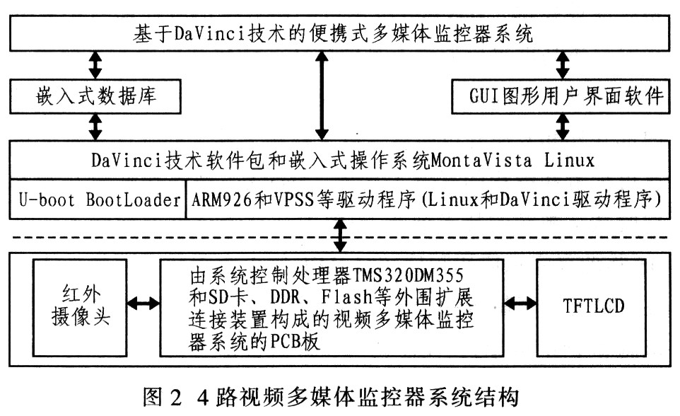 虚线以上是系统软件部分,软件部分包括系统软件、开发支撑软件和应用软件。系统软件包括加载引导Linux操作系统的。BootLoader-U-boot、DaVinci技术软件包和Mon-taVista Linux操作系统:开发支撑软件主要是用于数据管理的嵌入式数据库,进行用户图形界面开发的图形用户界面GUI软件;应用软件是在DaVinci技术、操作系统、数据库和图形用户界面软件基础上开发的便携式多媒体监控器系统。