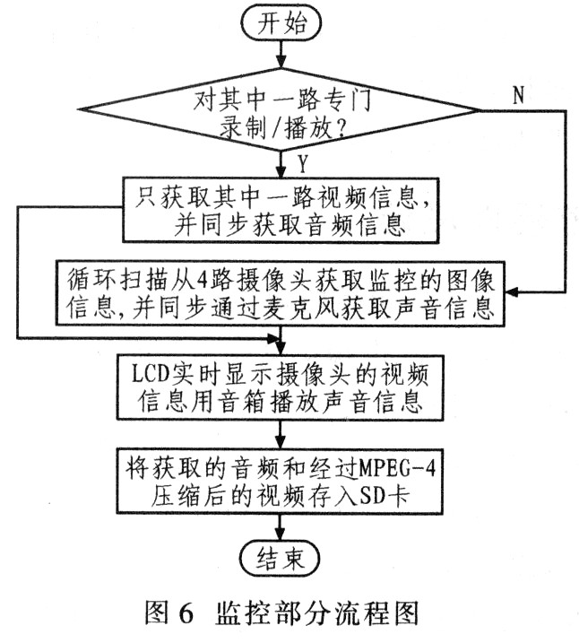 软件开发实现比较复杂,涉及到操作系统、音视频编解码算法及ARM和MJCP之间的分工协作.图5给出4路视频多媒体监控器的主程序流程,图6给出监控部分的流程图。