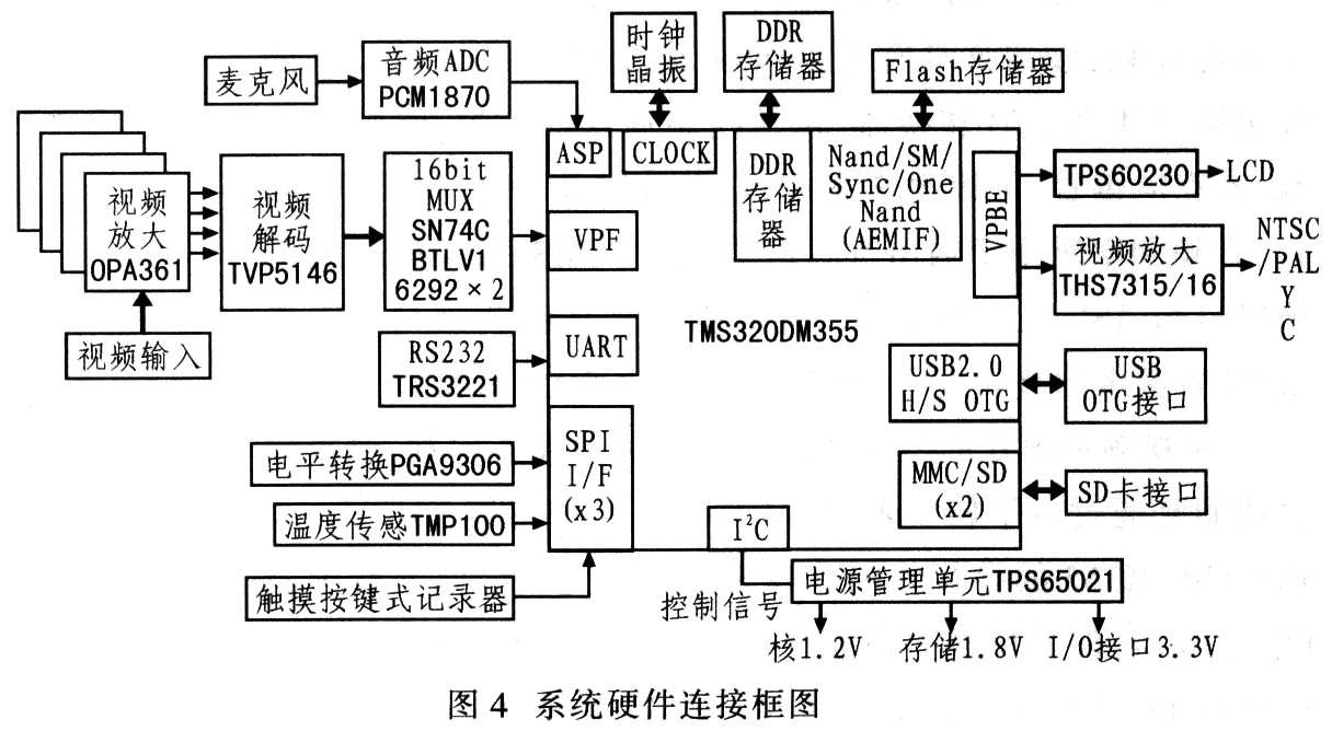 对视频和图片的操作功能可以通过触摸屏实现.触摸屏的功能是通过电平转换器PGA9306、温度传感器TMPl00与TMS320DM355的串行外围接口SPI共同完成。电平转换器PGA9306实现触摸屏的物理电平和CMOS电平之间的转换。而具有I2C串行接口的数字温度传感器实现触摸屏的功能。而触摸按键式记录器可以实现多媒体等操作的按键化操作。串口和USB OTG都是常规直接与物理接口的连接.其中USB OTG(On The Go)控制器,便于USB设备连接。