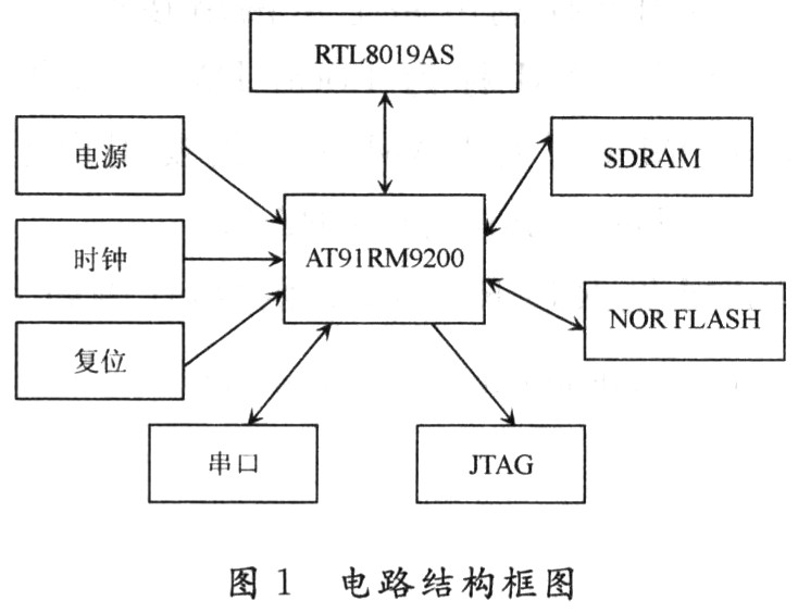 用RTL8019AS芯片设计的以太网控制器相关电路,可以通过RJ45连上以太网,在判断网卡芯片是否工作正常时,有两个依据,一是看状态指示LED是否有闪烁;二是用专用网络监听工具软件进行监听。在本设计中用两个LED指示灯表示接收和发送状态,当有网络连接且收发数据包时,LED闪烁。此外,网卡芯片单独不能工作,还必须有一个网络变压器在RJ45接口和网卡芯片中间进行电平转换,该设计中所用的电平转换器是20F001N。另外要特别注意,由于RTL8019AS的复位引脚是高电平有效,而AT91RM9200的NRST引脚是低电平有效,所以不能直接将两个引脚进行连接。该设计所用的解决方法是:在两引脚间加上一个共发射极的三极管,利用它的反相作用,来达到两个复位引脚间的电平匹配。同时,为了提高数据的传输速率,需要将网卡芯片设计成16位的数据通道,这就要求将RTL8019AS的IOCSl6B引脚用电阻上拉来达到设计目的。RTL8019AS与AT91RM9200进行连接还需要以下引脚:NOE,NEW,NCS2,D[O:15],一条中断线IRQ0以及地址线A[O:4](设计RTL8019AS的I/O基地址为300H,所以只需要SA[O:4]接A[O:4],而A[5:19]只需要接地即可)。至此,硬件电路已经设计完毕,整个电路的结构框图如图1所示。