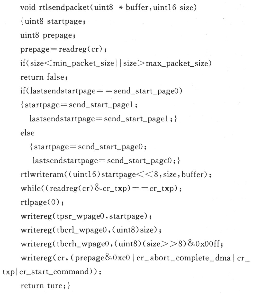 (2)发送数据帧:发送缓冲区可以存储2个最大的以太网帧,一个起始页为SEND_START_PAGEO,另一个起始页SEND_START_PAGEl,两个交替使用。发送数据帧时,CR寄存器设置为:writereg(cr,((prepage&OxCO)|cr_abort_compile_dma|cr_txp |cr_start_command]));发送数据包函数代码如下: