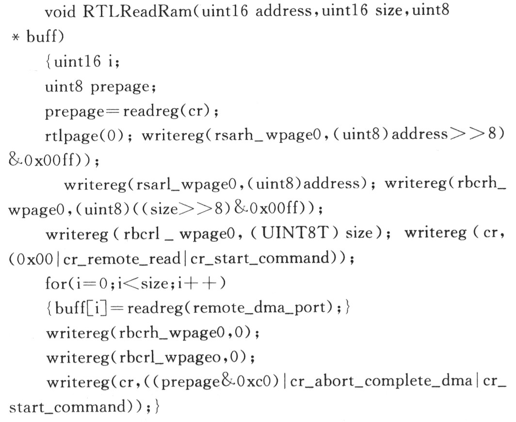 这个函数表示从address开始读取size个字节的内容到buff指向的内存中。设置CR寄存器指令为:writereg(cr,(0x00 | er_remote_read | cr_start_com-mand));然后从Remote DMA Port读取size次,就得到所需的数据。