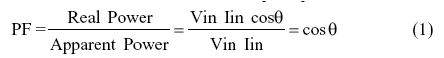 式(1)仅对纯电压和电流正弦波成立。对于非正弦波输入电流,即电源有整流输入时,情况有所不同。要找出原因,请参见图1,该图显示了典型的电源整流输入,以及得到的输入电流和输入电压波形。
