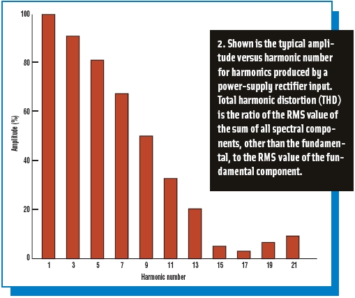 图2:对典型整流器输入的傅利叶分析显示,在输入电流中主要为奇次谐波。 |