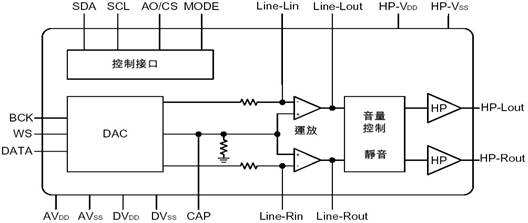 MS6335是集成了AB类立体声耳机驱动器的 16bit数字/模拟转换器(DAC),带有一个I2C SPI介面,同时还具有音量控制功能,其内部结构见图2。其独特的同步解码技术与精确匹配的初调电流源结合,有效地消除了零交替失真(zero-crossing),以产生高质量地音频。