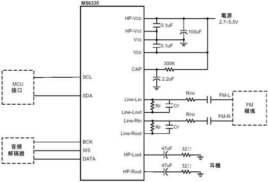 MS6335采用CMOS工艺进行生产,音量控制范围 6dB至-39dB(1.5dB/step),可以通过外部电阻器对输出电压进行调节,具有出色的电源抑制比(PSRR),可以再现高质量的音频,是低功耗的小外形便携式应用的理想选择。MS6335在带有FM功能的MP3播放器中的典型应用.见图3。