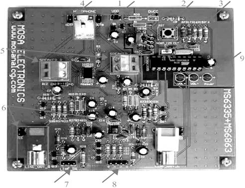 本设计由MS6335音频DAC和MS6863功率放大器组成,具备立体声数字及模拟信号两个输入端以及立体声Line-Out、扬声器与耳机三个输出端,图6是根据图1原理图制作的演示板。该演示板可切换音源与输出端,并可用作音量控制。