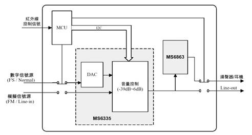 本设计以红外线及MCU作为控制,MCU保持 Standby状态,MS6335与MS6863初始状态为Power down mode。立体声数字信号源来自数字信号处理器(MP3解码器、机顶盒),可选择 I2S或者Normal格式。立体声模拟信号来自FM等信号。立体声输出可接32欧姆或16欧姆耳机,可直接驱动8欧姆或4欧姆立体声喇叭;Line-out则无驱动能力,需使用具有驱动能力之後级放大机。