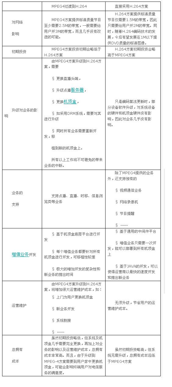 目前国内业界主要倾向的两种编码标准是H.264和MPEG-4,关于采用这两种编码技术的优劣势比较如下: