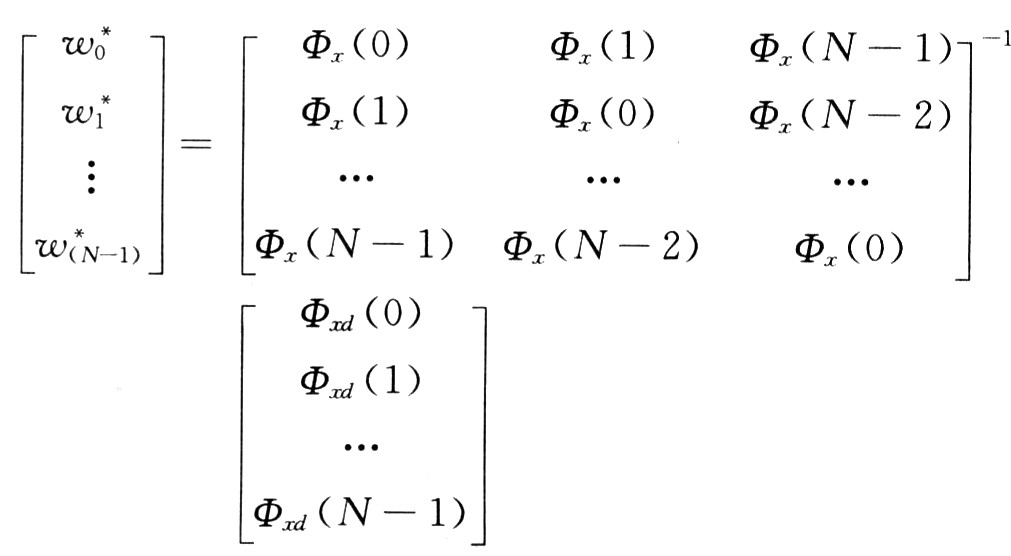这是一个线形方程组,如果R矩阵为满秩的,R-1存在,可得到权系数的最佳值满足:W*=R-1p。用完整的矩阵表示为: