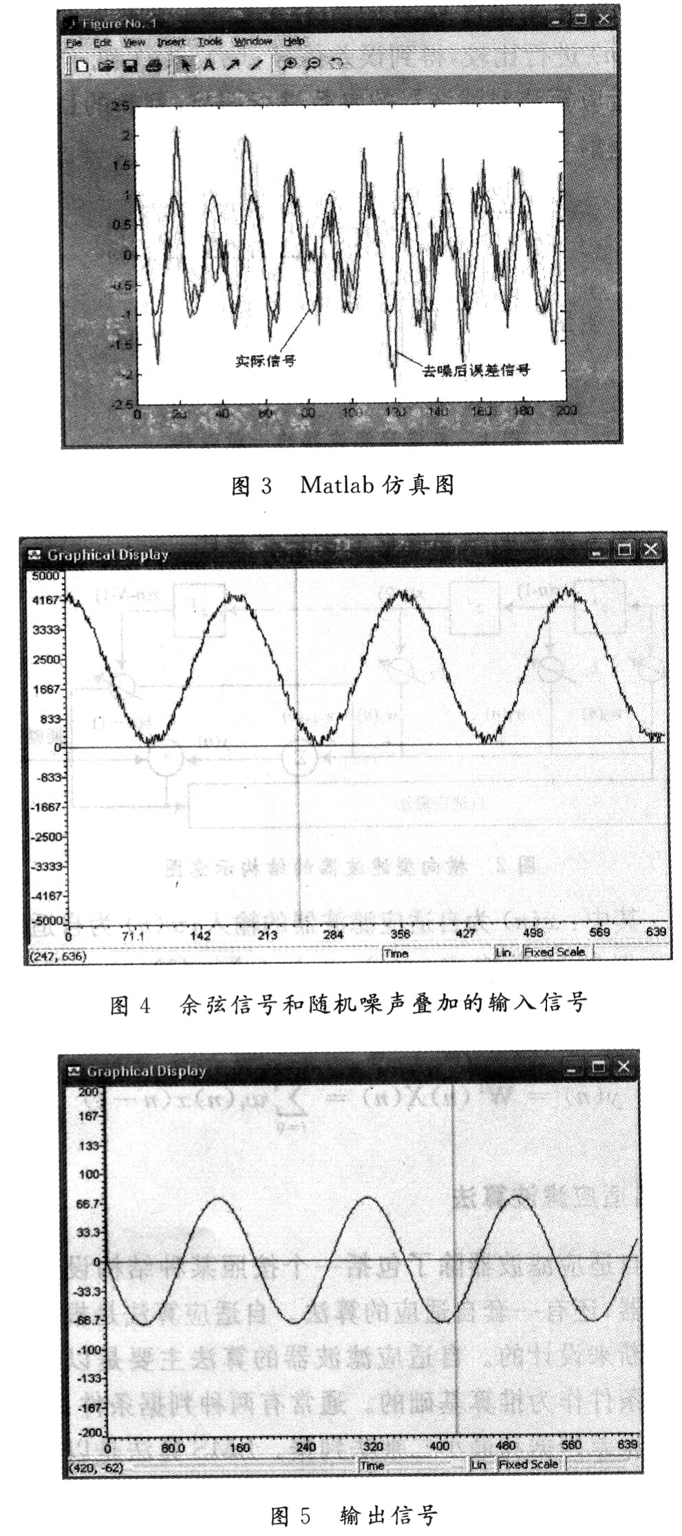 通过CCS软件环境,把滤波程序烧录到DSP芯片中,在CCS DSK C5000环境下输出仿真结果:输入信号为余弦信号和随机噪声的叠加。程序正确运行后,观察运行结果,得出如图4,图5所示的仿真图。