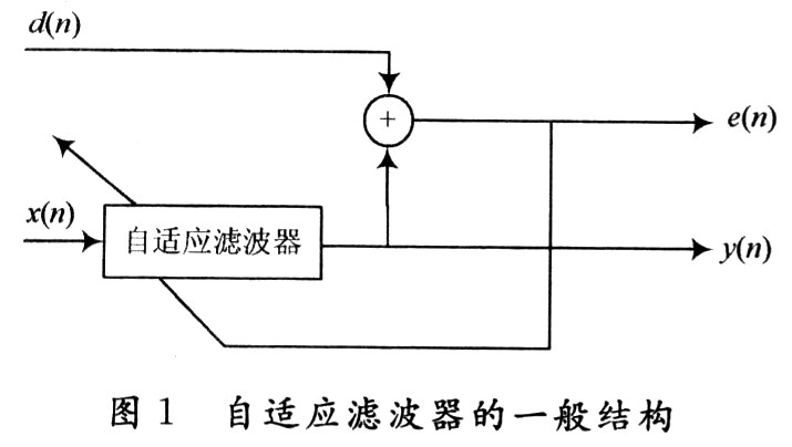 图1为自适应滤波器结构的一般形式,图中x(n)为输入信号,通过参数可调的数字滤波器后产生输出信号y(n),将输出信号y(n)与标准信号(或者为期望信号)d(n)进行比较,得到误差信号e(n)。e(n)和x(n)通过自适应算法对滤波器的参数进行调整,调整的目的使得误差信号e(n)最小。