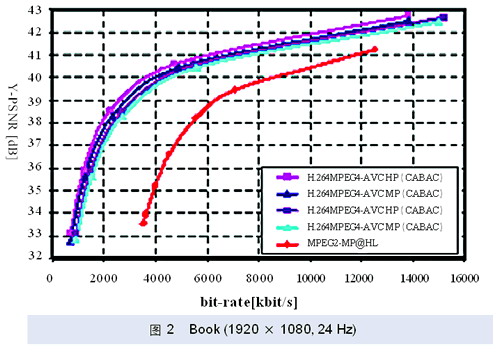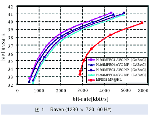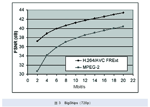 经测试,就高清视频编码来说,在相同配置情况下,Highprofile(HP)可以比Mainprofile(MP)节省10%的码流量,比MPEG-2MP节省60%的码流量。就单色静止图象压缩来说,当采用全帧内编码(INTRA)模式时,H.264 HP可以比JPEG-2000平均提高0.5dB。几个具体测试数据可以参见图1、图2和图3。