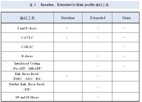 当今编码性能最好的视频编码国际标准H.264为ISO/IEC之下的MPEG标准组与ITU-TSG16之下的VCEG标准组联合组建的工作组JVT所制定,ITU称之为H.264,MPEG称之为MPEG-4Part10,此外还可以称为AVC、H.26L、JVT标准。JVT于2003年5月完成H.264基本部分标准制定工作,包含Baselineprofile、Extended profile和Main profile,分别包括不同的编码工具,如表1所示。