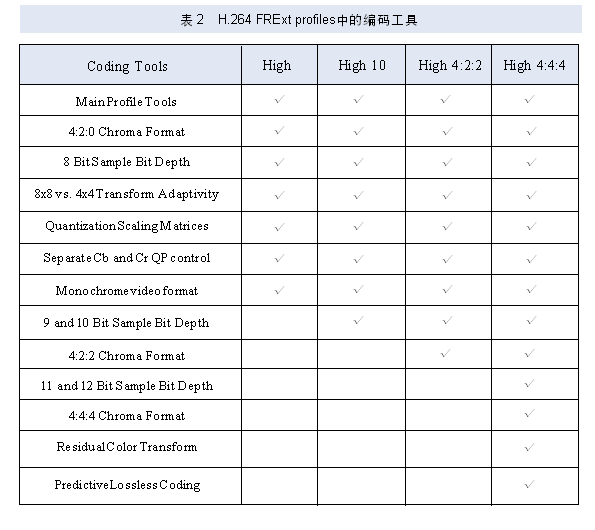 H.264Baselineprofile、Extendedprofile和Main profile都是针对8位样本数据、4:2:0格式的视频序列,FRExt将其扩展到8~12位样本数据,视频格式可以为4:2:0、4:2:2、4:4:4,设立了High profile(HP)、High 10 profile(Hi10P)、High 4:2:2 profile(Hi422P)、High 4:4:4 profile(Hi444P) 4个profile,这4个profile都以Main profile为基础,并且为逐渐扩展的包含关系,其所包含的编码工具和相互关系如表2所示。