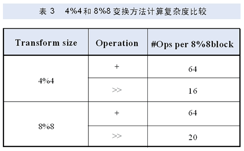 其计算精度为(8+n)位,其中输入视频样本为n位精度。该变换方法可以通过蝶形方式快速实现,其计算复杂度比H.264中的4%4变换方法稍多一点,见表3所示。