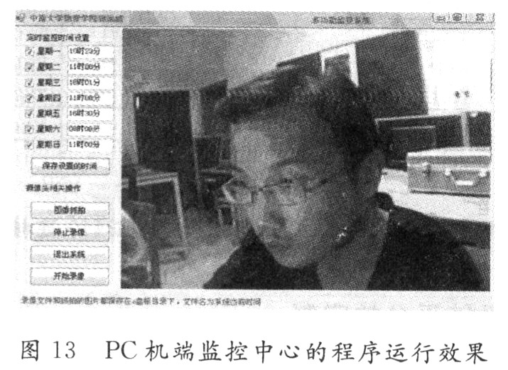 监控中心是无线视频监控系统的核心部分,它负责管理整个系统并显示监控的图像。在该论文中,监控中心的应用程序实现了实时监控、定时录像、抓拍等功能。在系统中监控程序的开发,同时使用了C#语言和WIN32 API,利用C#语言基于事件的编程方法,设计了程序图形界面,利用VFW接口中的API函数基于消息机制设计了底层图像数据的读取和显示。该系统中API函数主要来自于VFW软件工具包。VFW(Video forWindows)提供了一系列应用程序编程接口(API),用户可以通过它们很方便地实现视频捕获、视频编辑及视频播放等通用功能,还可利用回调函数开发更复杂的视频应用程序。其特点是播放视频时,不需要专用的硬件设备,而且应用灵活,可以满足视频应用程序开发的需要。监控中心的程序调试运行效果如图13所示。