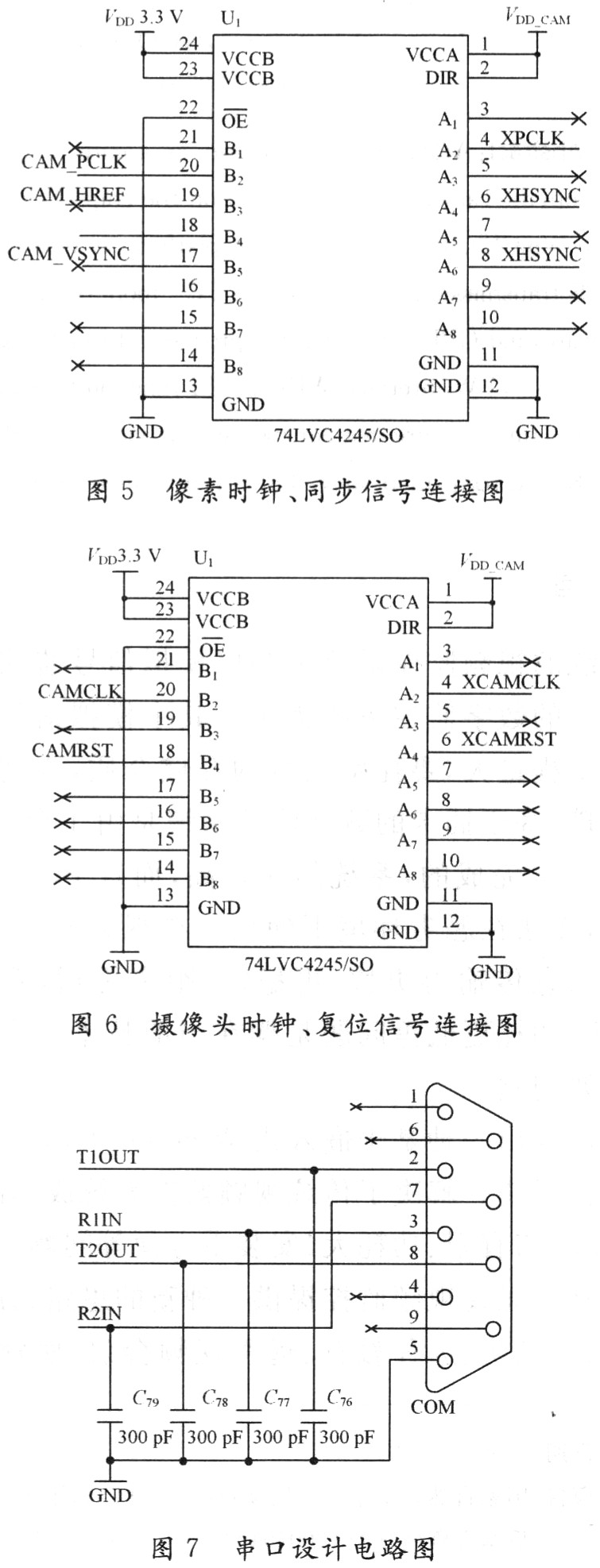 其中用到了TI公司的电平转换芯片74LVC4245,是一种双电源的电平移位器,电平移位在其内部进行。5 V端用5 V电源作为VDD_CAM,而3.3 V端则用3.3 V作为VCC33。双电源能保证两边端口的输出摆幅都能达到满电源幅值。