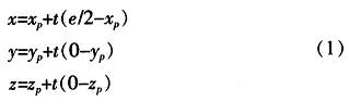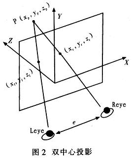 左视点Leye和右视点Reye均位于X轴上,两视点间的距离为e,两视点连线中心为坐标原点,则左视点的坐标为(-e/2,0,0),右视点的坐标为 (+e/2,0,0)。投影平面平行于XY平面,到左右视点的距离均为d。三维空间中一点P(xp,yp,zp)在左视点投影中的坐标为 (xl,yl,zl),在右视点投影中的坐标为(xr,yr,zr),则zl=zr=d。点P(xp,yp,zp)和Reye投影线的参数方程为: