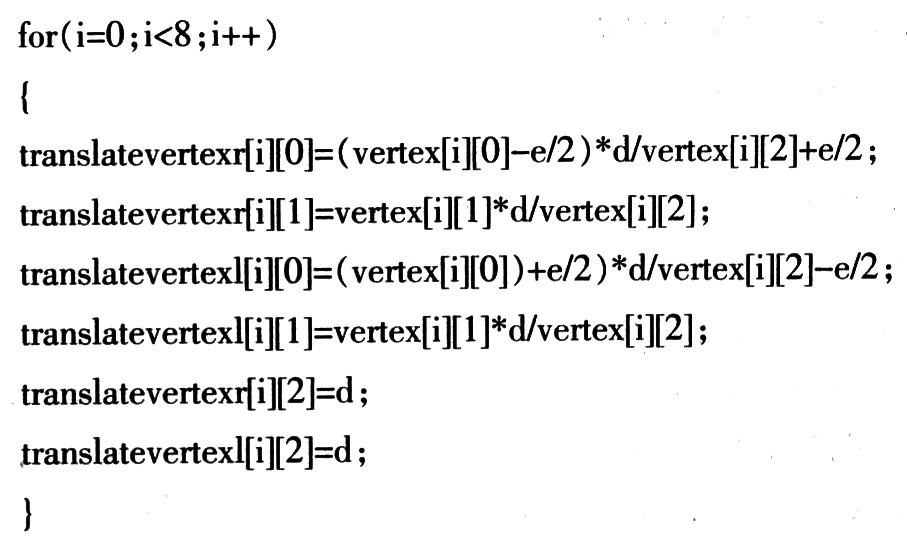 按上述投影算法计算出立体图像对后,应用OpenGL绘制立体图像对,分别用红、绿两种颜色绘制右眼和左眼的图像。以一个变长为10 cm,中心点在原点的正方体为例,设两视点间距离e为5 cm,投影面距高观察者d为40 cm,考察正方体的一个顶点(5,5,5),由上述投影算法可得:xr=32 cm,xl=48 cm,yl=yr=4040 cm,zr=zl=d=40 cm对8个顶点分别计算后,连接相应的立体透视投影点,即可得该立方体的立体图像对。用数组vertex[8][3]存储顶点,数组translatevertexr[8][3]存储右眼投影计算后坐标,数组translatevertexl[8][3]存储左眼投影计算后的坐标,对相应的点进行投影计算: