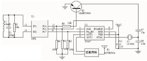 图 2是胎压传感模块的原理图,软件设置P14作为数据流输出端口,数据流的高低电平不断切换开集电极三极管Q1的导通和闭合,而达到对晶振Y1负载电容 C7||C8的容值改变,由此影响晶振的谐振频率,实现FSK的调制功能。另外电路中的C1、L1、R1相并联,组成低频接口,专用于接收125kHz的低频信号,可以实现对胎压传感的主动唤醒,从而进行功能检测或双向通信。