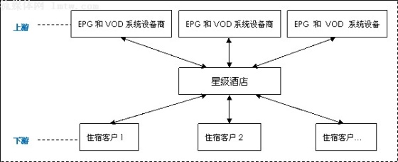 上图中,酒店IPTV运营商需要整合设备和软件厂商、产品集成商、内容提供商,以及政府广电各方面资源,然后再统一打包整合后提供给星级酒店商,通过酒店商再给每个客房的住宿客户提供特色化、短时间的点对点个性化服务。住宿客户在客房通过酒店IPTV系统可以直接跟商户交易,或者点播自己喜欢的影片。这样星级酒店商对于酒店IPTV运营商来说也就是一个渠道商。