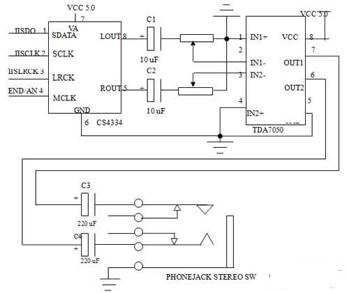 图2S3C44B0X与CS4334以及TDA7050的连接示意图