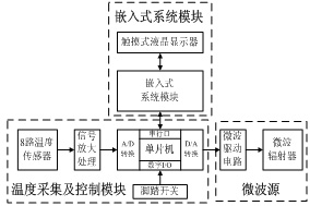 整个硬件系统分为三大部分,即嵌入式系统模块、温度采集及控制模块以及微波源。图1是系统的硬件结构图。