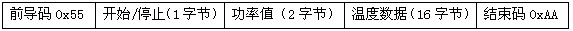 (1)数模转换器向嵌入式系统模块发送的数据长度为每帧21字节,传输格式(见表1)如下:①前导码为0x55(1字节);②开始/停止(1字节):0x00表示停止;0xFF表示开始③功率值(2字节):功率值为一个范围(0—4095);④温度值(16字节):每个温度值取值范围为0-4095(2字节),所以共需16字节;⑤结束码为0xAA。