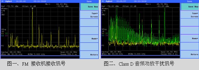 图一为一般FM接收机天线端的接收讯号。当D类功放动作时,其辐射出来的谐波讯号如没有效处理,结果将如图二,谐波讯号覆盖原有的FM讯号,使FM收讯品质下降,甚至无法接收。