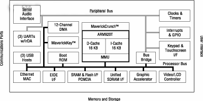 微处理器作为系统的核心控制器件,其各项指标往往是工程师们在选型时最为关注的。与其他基于ARM9内核的嵌入式微处理器相比较,Cirrus Logic公司的EP9315无论是在整体性能、片内外围接口,以及系统成本方面,都有比较明显的优势。EP9315的结构框图如图1所示。