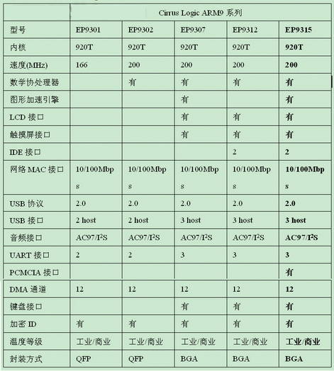 4. 丰富的片内/外围接口资源,完全可以满足目前各类医疗电子产品的应用需求。从表1中可以看到Cirrus Logic的基于ARM9的全系列微处理器的各项参数。