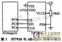 以ST7920为控制器的YM12864R点阵式液晶显示模块和单片机之间的接口方式有并行和串行两种。本文采用串行接口方式,单片机选用AVR公司的ATmega16。接口电路如图1所示。其中,PC4控制串行的片选信号(CS),低电平有效;PC5控制串行的数据线(SID);PC6控制串行的时钟输入(CLK)。ST7920通过VCC(+5 V)和GND之间串联一个10 kΩ的电阻来控制背光强度。如果不需要调节对比度,可以直接将VLCD引脚接VCC(+5 V),此时对比度最大。
