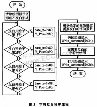 字符反白程序流程如图3所示。其中,base_x表示绘图起始的行地址;Y_Pos表示绘图起始的列地址;第1行至第4行的起始地址分别是(0x80,0x80),(0xS0,0xg0),(0x88,0xS0)和(0x88,0x90)。