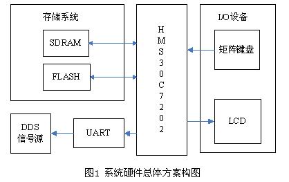 硬件部分以HMS30C7202微处理器为核心,FLASH和SDRAM作为存储设备,从矩阵键盘接受输入,并在LCD上显示相应内容,同时通过UART与DDS信号源进行通讯。存储系统中的FLASH用来固化程序及保存波形数据和系统参数;SDRAM是系统上电正常运行后的代码和数据载体。