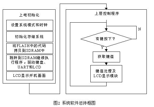 软件部分又可分成底层驱动程序和上层控制程序两部分。底层驱动包括设置系统模式和时钟,初始化存储器,代码拷贝,初始化LCD控制器,中断控制器和UART控制器等。上层控制程序不断查询是否有键按下。若有键按下,则执行相应的任务,LCD显示相应内容;同时若需要,通过UART向DDS信号源发出控制命令。