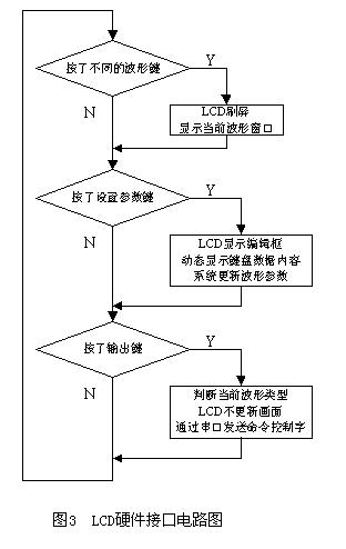 DDS任意波信号发生器的上层控制程序的主体就是键值处理及LCD显示模块,其软件流程图如图5所示。它主要完成三方面的功能。(1)按了不同的波形键。由于各种波形的形状、参数种类和个数不尽相同,当按了波形键且和上一次按的波形键不一样时,LCD要刷屏并显示当前波形窗口。(2)按了设置参数键。这一般用来修改波形参数或系统参数。LCD必须提供编辑框或选择框,动态显示键盘输入的数字和单位。对一些需要保存的参数,则还要将这些数据保存在FLASH中。(3)按了输出键。LCD不需要修改显示画面,HMS30C7202通过串口向DDS信号源发送命令控制字。