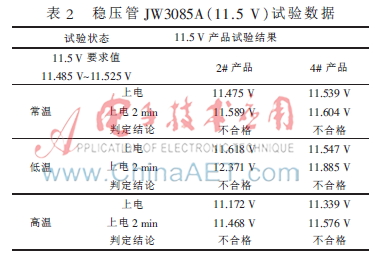 对749厂首批提供的JW3085A稳压管进行了电源板常温试验和组件高低温循环替代试验,23 V试验编号为:1#、3#,11.5 V试验编号为2#、4#,23 V试验数据如表1所示,11.5 V试验数据如表2所示,从表格中数据可以看出,稳压管性能参数受通电时间及温漂影响较大。而且可以看出,稳压管参数指标在常温、高低温不是很稳定。