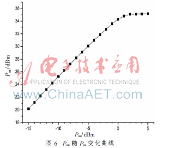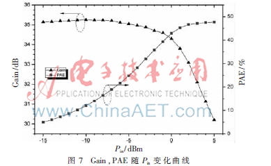 本芯片采用InGaP/GaAs HBT工艺制作,图4为芯片实物图,DIE面积为1 mm×1 mm,整体封装大小为4 mm×4 mm。图5为本设计S参数测试结果,测试平台为安捷伦矢量网络分析仪E5071C。测试结果表明,在2 GHz频率处该设计的S参数为:S21=35.1 dB,S11<-10 dB,S22<-10 dB,从S参数看出本设计获得了很好的小信号性能。图6为输出功率和输入功率的关系图,从图可知当Pin小于0 dBm时,放大器工作于线性工作状态,当Pin大于0时开始出现压缩,到达3 dBm时,输出功率已经饱和,此时Pout=35.2 dBm,放大器的1 dB压缩点为P1dB=34.2 dBm。从该图可知,该放大器获得了较好的线性度。图7为增益Gain和效率PAE随着输入功率的变化的曲线图,该图表明该设计的增益在Pin<0 dBm时,增益波动小于0.2 dB,表明该设计获得了很好的AM-AM,在饱和工作时,即Pout=35.2 dBm时,效率为PAE=48%;工作于1 dB压缩点时,即Pout=34.2 dBm时,效率为PAE=43%。从效率曲线图可知,该放大器不但在饱和工作时获得了很高的效率,在线性工作时也获得了很好的效率。表1是该设计的谐波性能与其他设计的比较,从表1可知本设计在考虑二次谐波同时还兼顾了高次谐波,达到了良好的谐波抑制,特别是在对高次谐波的处理上。