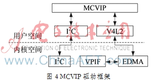 采集端基于Montavista公司Linux-2.6.10操作系统,采用V4L2进行视频数据采集。TVP5158与DM6467间采用VPIF接口无缝传输。为了让数据采集更加便捷,对V4L2驱动与I2C驱动进行二次封装。同时,为了提高数据传输效率,减少CPU开销,将底层EDMA驱动也封装在其中。面向应用层,3个接口被抽象为一个MCVIP接口[4-5]。MCVIP驱动框架如图4所示。