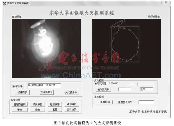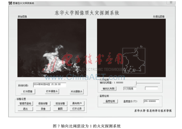 根据以上所述的基于红外图像轴向比的火灾判别算法,设计了火灾探测软件,使用一个采集红外图像的摄像头,若采集到的图像超过所设的轴向比阈值,则显示此时的温度值及“火灾隐患”,同时进行语音报警及GSM短信报警。图7所示为轴向比阈值设定为1时的火灾探测系统。