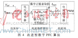 式中,N表示一个周期内的采样次数,取2 000次;V(i)表示第i次采样值,避免了引入二次谐波,提高了功率因数。对于传统PFC电路的基准电流容易受到输入电压干扰的缺点,提出了采用电压环和电流环双闭环数字PI控制算法。在此算法中,输入电流正弦波形由DSP内部软件完成,当输入电压受到干扰发生畸变时,能够保证输出为高度正弦的电流波形,从而使系统保持很高的功率因数,算法结构如图4所示。
