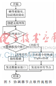 协调器通过CAN控制器ADM3053把接收到的子节点的ZigBee协议数据转换为CAN协议数据,然后通过CAN总线、USB数据线将数据送至上位机。此外,下行通信可以向下传送主机的命令指令,通过协议转换把数据包发送给分布式网络的所有节点。
