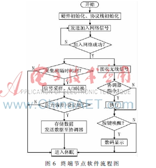 终端采集节点上载有3个通道压力传感器,负责数据的采集、存储和上传,是系统的关键部分。程序流程如图6,终端节点上电后,无线模块自动进行初始化,然后请求加入无线网络。