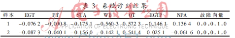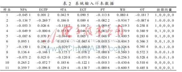 将采集到的相关传感器检测输出数据经过数字滤波处理,并对其进行归一化处理后,作为系统输入样本数据,经基于改进BP神经网络的故障诊断系统处理后,将APU的健康状况打印输出出来,供机务维修人员使用。部分故障样本数据以及模型诊断结果如表2、表3所示。